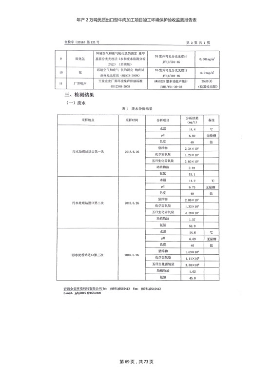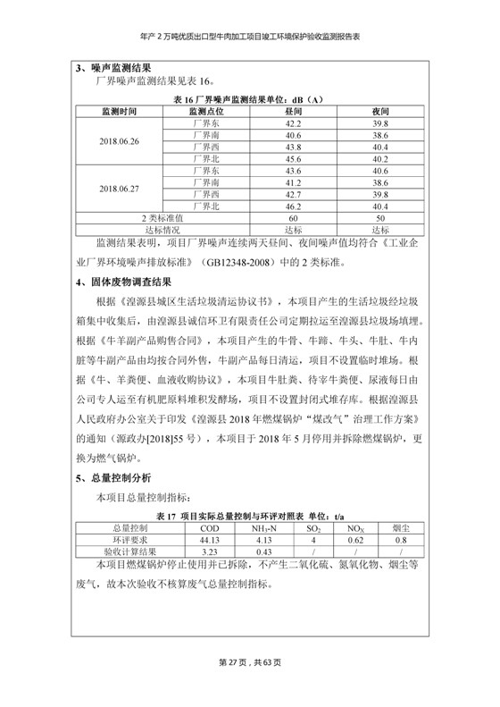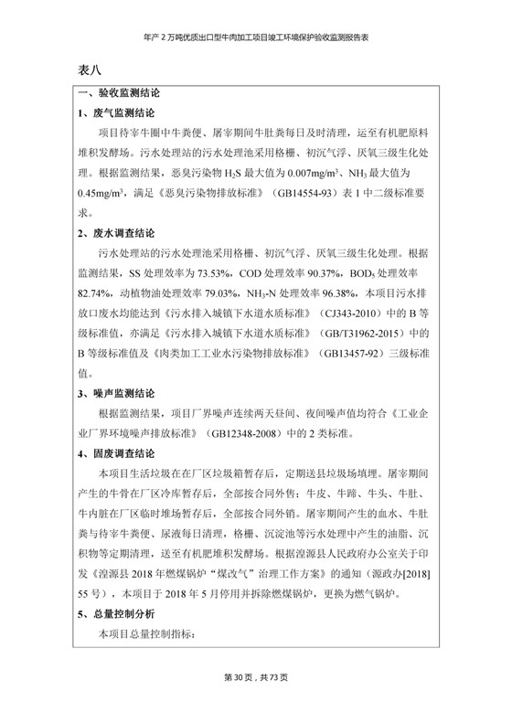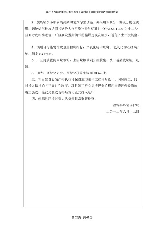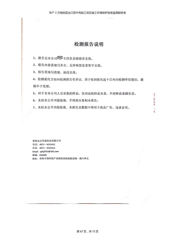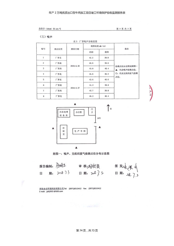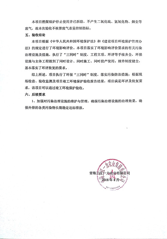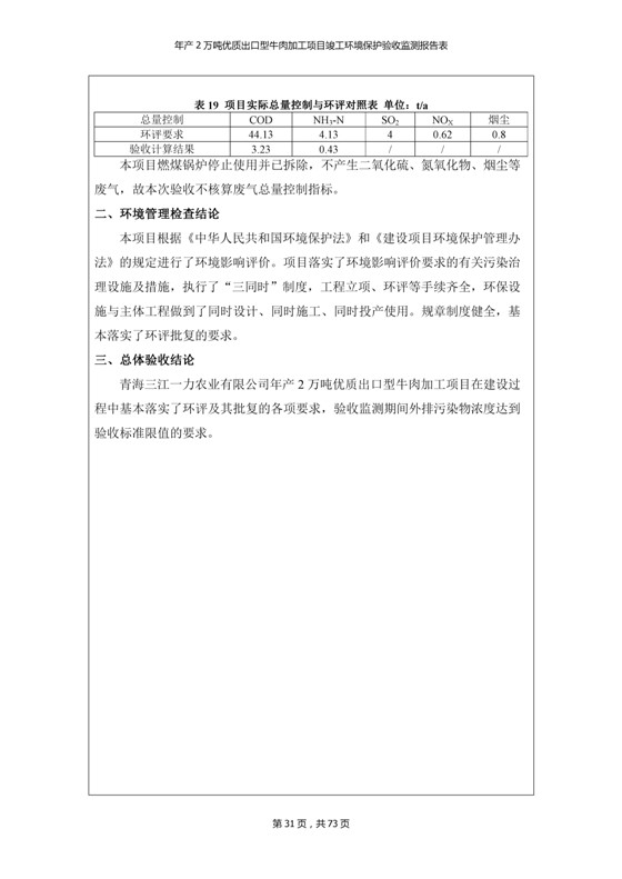 根據(jù)中華人民共和國國務(wù)院令第253號《建設(shè)項(xiàng)目環(huán)境保護(hù)管理?xiàng)l例》(中華人民共和國國務(wù)院令第682號《國務(wù)院關(guān)于修改〈建設(shè)項(xiàng)目環(huán)境保護(hù)管理?xiàng)l例〉的決定》和《建設(shè)項(xiàng)目竣工環(huán)境保護(hù)驗(yàn)收暫行辦法》,嚴(yán)格依照有關(guān)法律法規(guī),建設(shè)項(xiàng)目環(huán)境保護(hù)設(shè)施驗(yàn)收技術(shù)規(guī)范,本項(xiàng)目環(huán)評報(bào)告表和環(huán)保審批部門審批意見以及企業(yè)自行驗(yàn)收相關(guān)要求等對本項(xiàng)目進(jìn)行驗(yàn)收,本項(xiàng)目符合環(huán)保驗(yàn)收條件,可以通過環(huán)保驗(yàn)收。 青海三江一力農(nóng)業(yè)有限公司組織召開年產(chǎn)2萬噸優(yōu)質(zhì)出口型牛肉加工項(xiàng)目(一期工程)驗(yàn)收組意見.