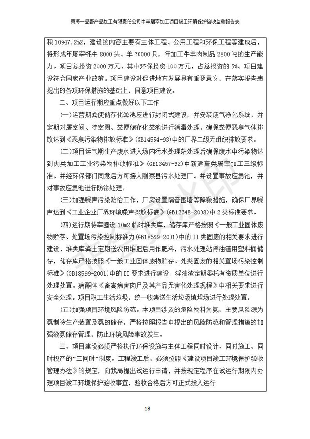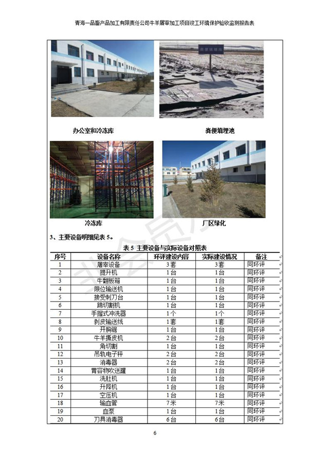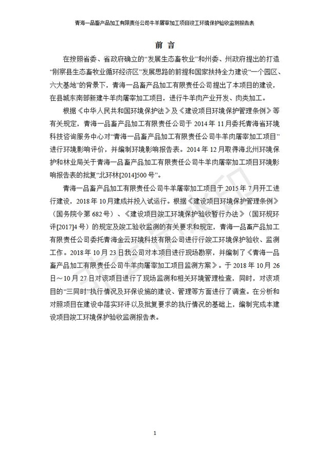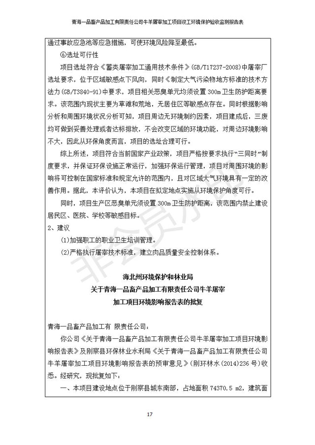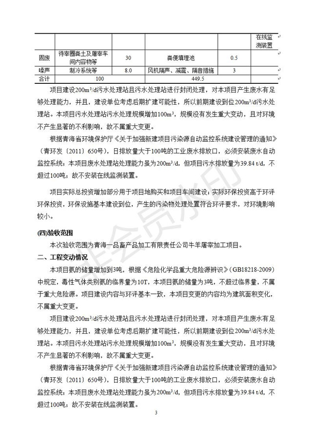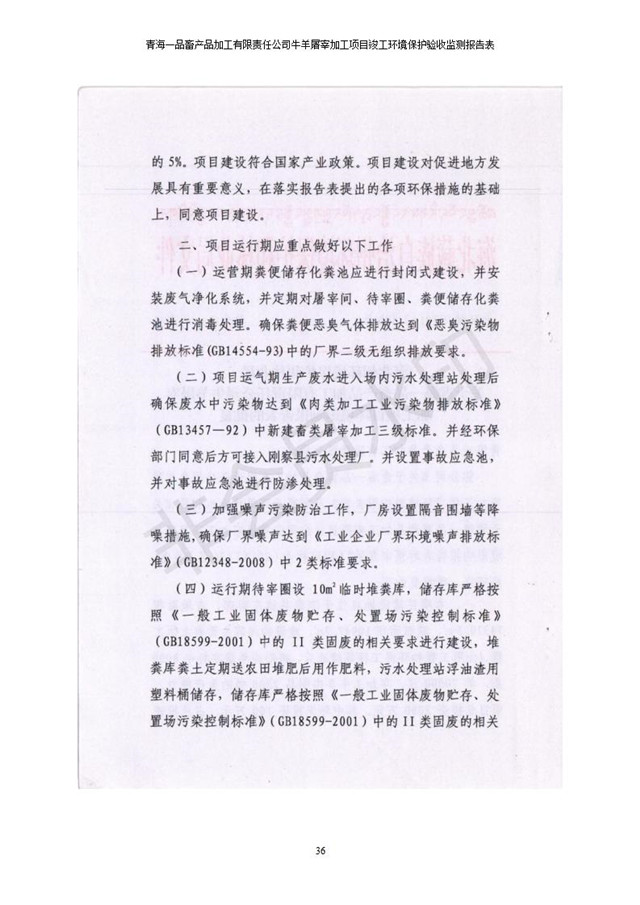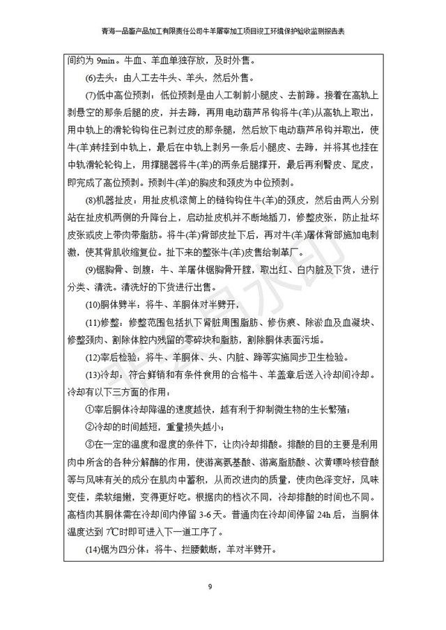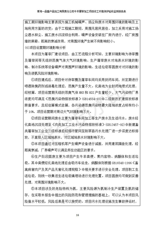 根據(jù)中華人民共和國(guó)國(guó)務(wù)院令第682號(hào)《國(guó)務(wù)院關(guān)于修改〈建設(shè)項(xiàng)目環(huán)境保護(hù)管理?xiàng)l例〉的決定》和《建設(shè)項(xiàng)目竣工環(huán)境保護(hù)驗(yàn)收暫行辦法》(國(guó)務(wù)院令682號(hào)),青海一品畜產(chǎn)品加工有限責(zé)任公司牛羊屠宰加工項(xiàng)目(包括竣工環(huán)境保護(hù)驗(yàn)收監(jiān)測(cè)報(bào)告表和驗(yàn)收意見)公示如下。 一、項(xiàng)目名稱:青海一品畜產(chǎn)品加工有限責(zé)任公司牛羊屠宰加工項(xiàng)目竣工環(huán)境保護(hù)驗(yàn)收監(jiān)測(cè)報(bào)告表 二、地點(diǎn):剛察縣縣城東大街加油站東側(cè) 三、建設(shè)單位:青海一品畜產(chǎn)品加工有限責(zé)任公司 四、建設(shè)內(nèi)容:項(xiàng)目地面積17453m2,項(xiàng)目建設(shè)內(nèi)容包括牛羊屠宰車間、牛羊肉加工車間、冷庫、辦公區(qū)、污水處理站等。 五、聯(lián)系人:張工 七、公示時(shí)間:二〇一九年一月十一日至二〇一九年二月七日 公示期間,對(duì)上述公示內(nèi)容如有異議,請(qǐng)以書面形式反饋,個(gè)人須署真實(shí)姓名,單位須加蓋公章。