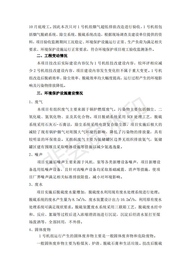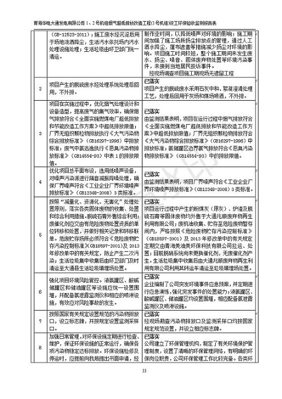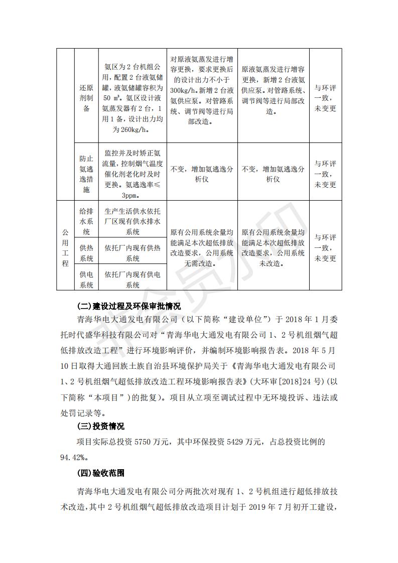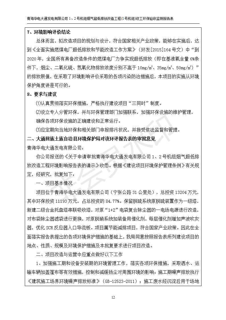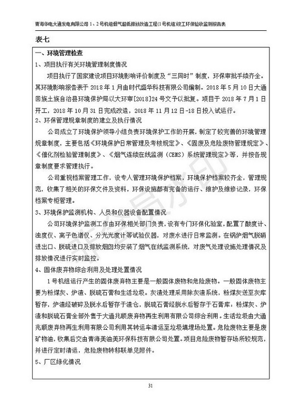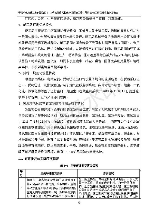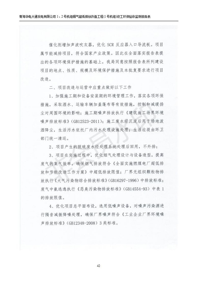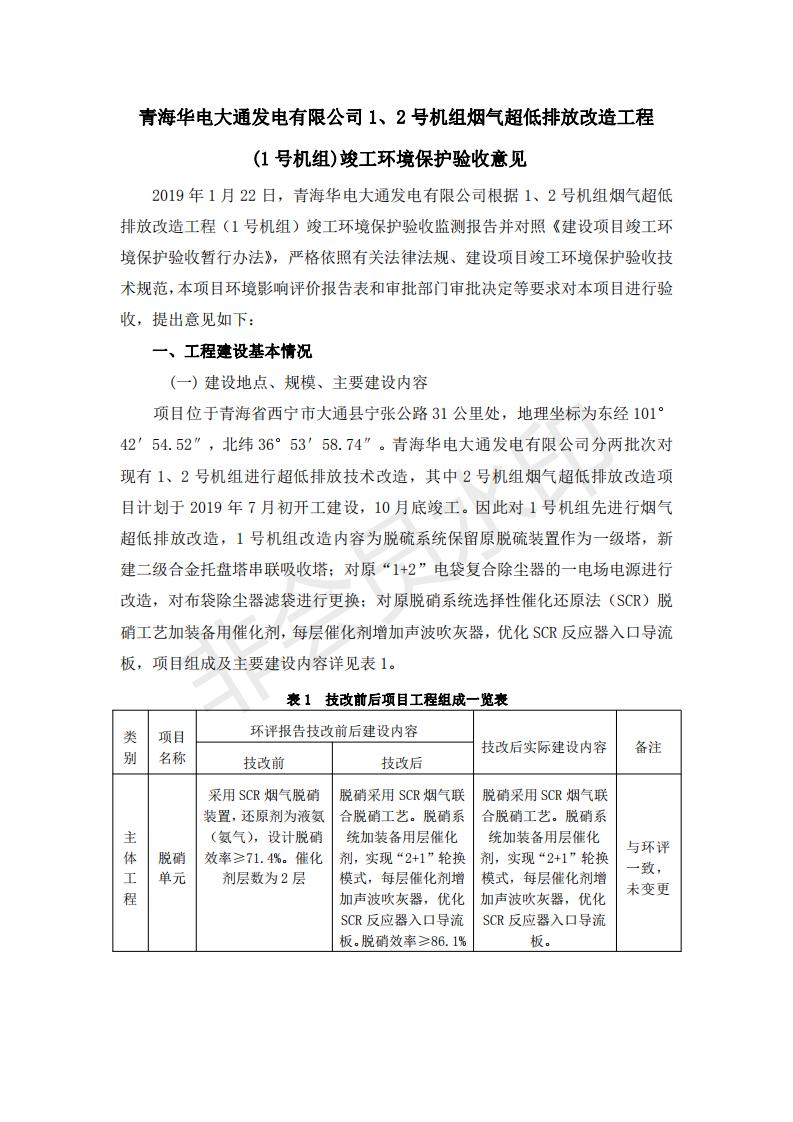 根據(jù)中華人民共和國國務(wù)院令第682號《國務(wù)院關(guān)于修改〈建設(shè)項目環(huán)境保護(hù)管理條例〉的決定》和《建設(shè)項目竣工環(huán)境保護(hù)驗收暫行辦法》(國務(wù)院令682號),青海華電大通發(fā)電有限公司1、2號機組煙氣超低排放改造工程(1號機組) (包括竣工環(huán)境保護(hù)驗收監(jiān)測報告表和驗收意見)公示如下。 一、項目名稱:青海華電大通發(fā)電有限公司1、2號機組煙氣超低排放改造工程(1號機組) 竣工環(huán)境保護(hù)驗收監(jiān)測報告表 二、地點:青海省西寧市大通縣寧張公路31公里處 三、建設(shè)單位:青海華電大通發(fā)電有限公司 四、建設(shè)內(nèi)容:1號機組煙氣超低排放改造,1號機組改造內(nèi)容為脫硫系統(tǒng)保留原脫硫裝置作為一級塔,新建二級合金托盤塔串聯(lián)吸收塔;對原“1+2”電袋復(fù)合除塵器的一電場電源進(jìn)行改造,對布袋除塵器濾袋進(jìn)行更換;對原脫硝系統(tǒng)選擇性催化還原法(SCR)脫硝工藝加裝備用催化劑,每層催化劑增加聲波吹灰器,優(yōu)化SCR反應(yīng)器入口導(dǎo)流板。 五、聯(lián)系人:張工 六、聯(lián)系電 話:0971-6515411 七、公示時間:二〇一九年二月十三日至二〇一九年三月十二日 公示期間,對上述公示內(nèi)容如有異議,請以書面形式反饋,個人須署真實姓名,單位須加蓋公章。
