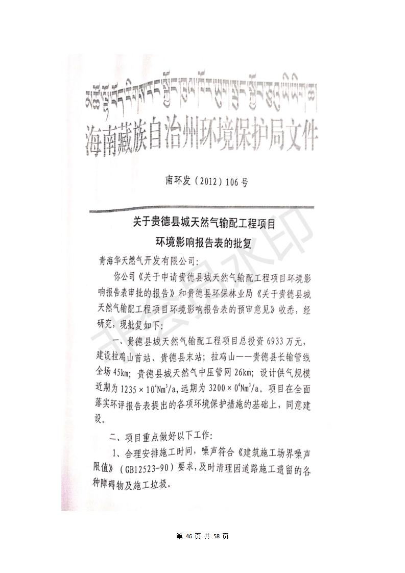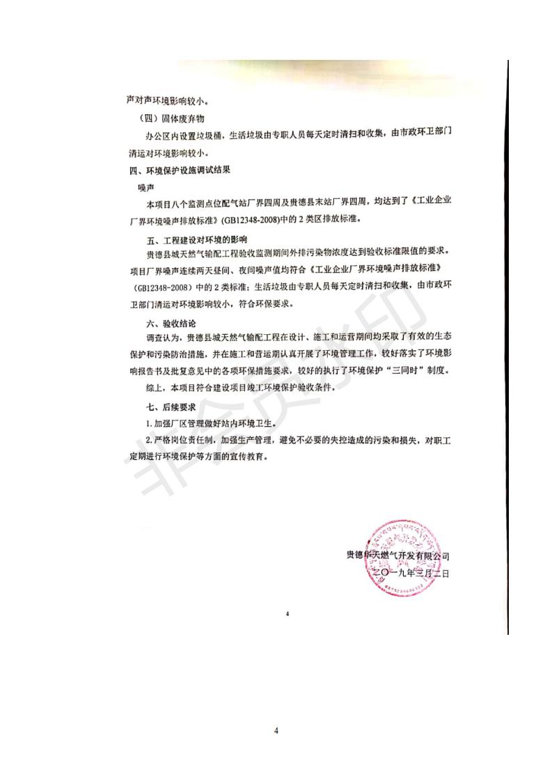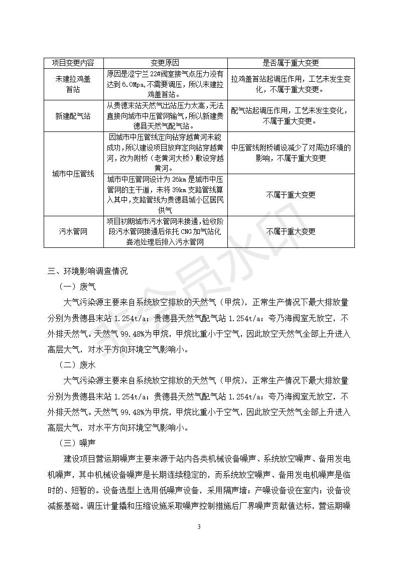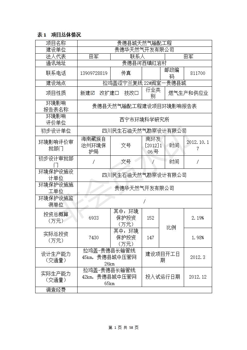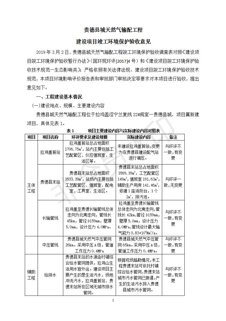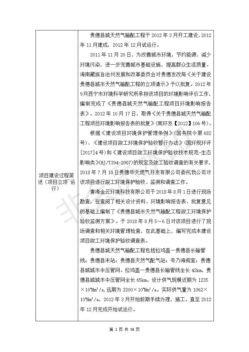 根據(jù)中華人民共和國務院令第682號《國務院關于修改〈建設項目環(huán)境保護管理條例〉的決定》和《建設項目竣工環(huán)境保護驗收暫行辦法》(國務院令682號),貴德縣城輸配管線工程竣工環(huán)境保護驗收內容(包括竣工環(huán)境保護驗收調查表和驗收意見)公示如下。 一、項目名稱:貴德縣城天然氣輸配工程 二、地點:拉雞蓋澀寧蘭復線22#閥室-貴德縣城 三、建設單位:貴德華天燃氣開發(fā)有限公司 四、建設內容:貴德縣末站、貴德縣配氣站、貴德縣中壓管網(wǎng)、拉雞蓋22#閥室-貴德縣城長輸管線 五、公示時間:二〇一九年三月十一日至二〇一九年四月八日 六、聯(lián)系人:張工 公示期間,對上述公示內容如有異議,請以書面形式反饋,個人須署真實姓名,單位須加蓋公章。