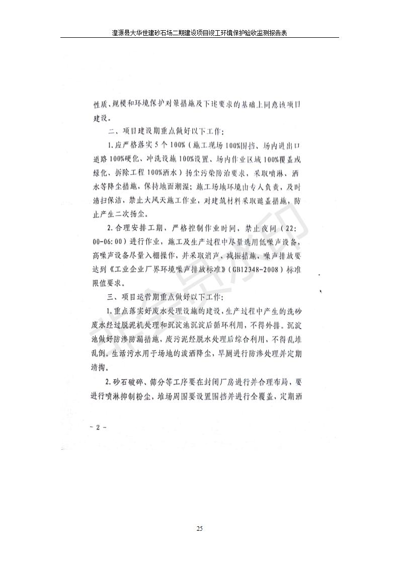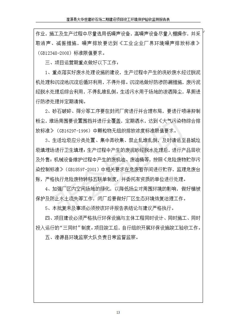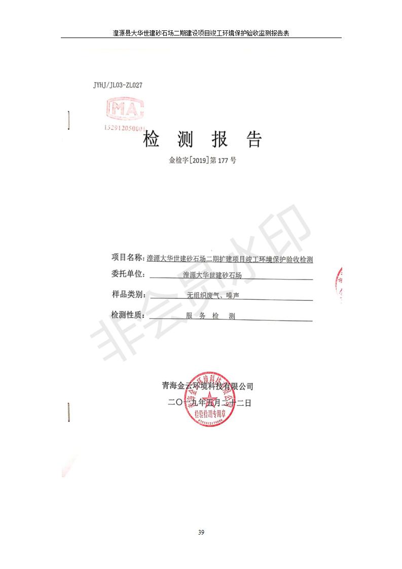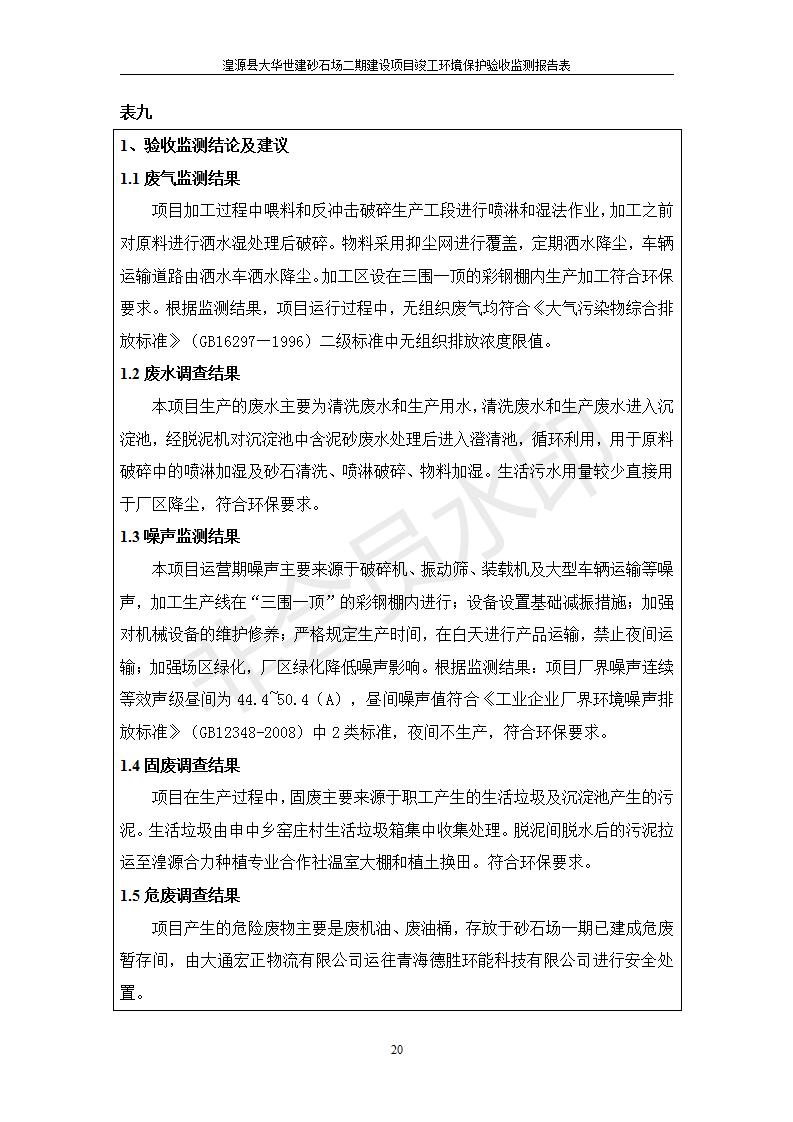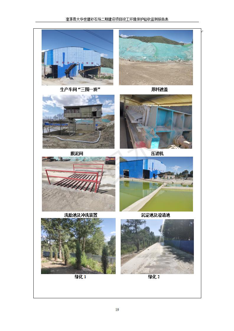 根據(jù)中華人民共和國國務(wù)院令第682號《國務(wù)院關(guān)于修改〈建設(shè)項目環(huán)境保護管理條例〉的決定》和《建設(shè)項目竣工環(huán)境保護驗收暫行辦法》(國務(wù)院令682號),湟源大華世建砂石場湟源縣大華世建砂石場二期建設(shè)項目(包括竣工環(huán)境保護驗收監(jiān)測報告表和驗收意見)公示如下。 一、項目名稱:湟源縣大華世建砂石場二期建設(shè)項目 二、地點:湟源縣申中鄉(xiāng)窯莊村沙崗大小灣 三、建設(shè)單位:湟源大華世建砂石場 四、建設(shè)內(nèi)容:項目主要建設(shè)砂石料產(chǎn)品加工生產(chǎn)區(qū)、原料堆場、產(chǎn)品堆場、辦公區(qū)等。五、聯(lián)系人:張工 六、聯(lián)系電 話:0971-6515411 七、公示時間:二〇一九年七月二十五日至二〇一九年八月二十一日公示期間,對上述公示內(nèi)容如有異議,請以書面形式反饋,個人須署真實姓名,單位須加蓋公章。