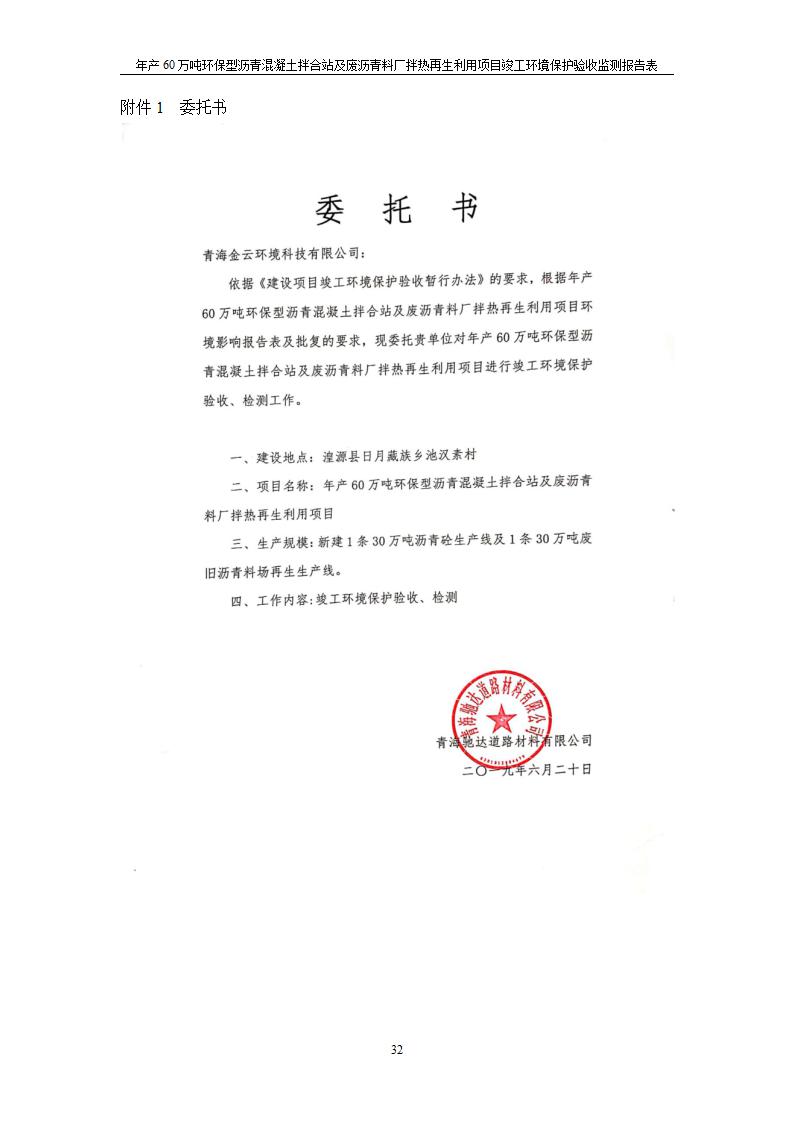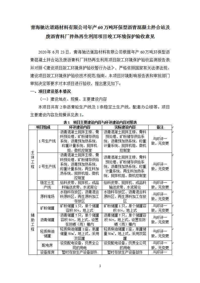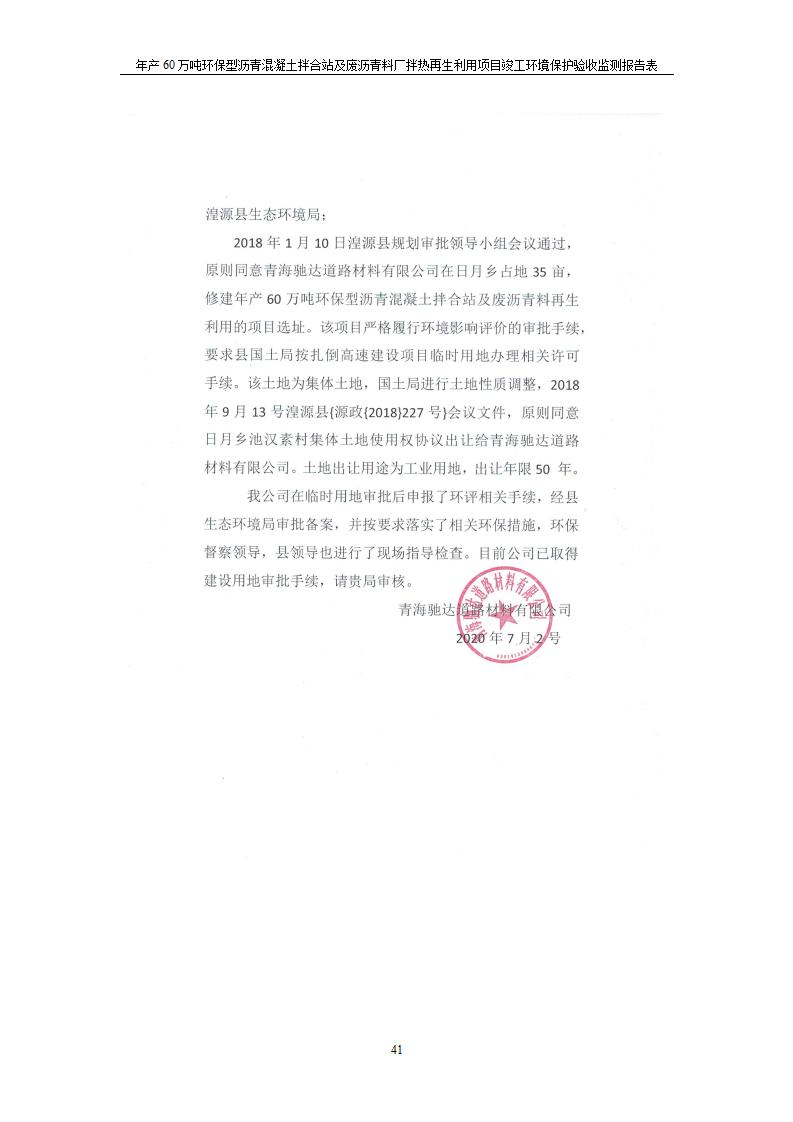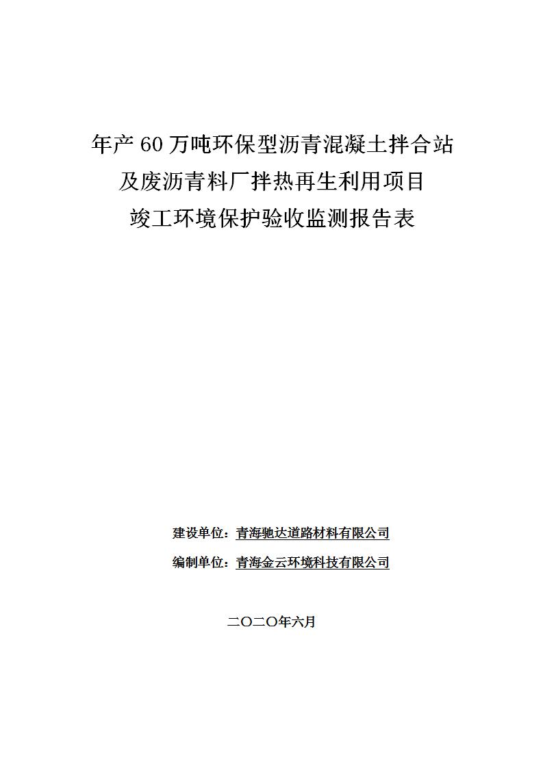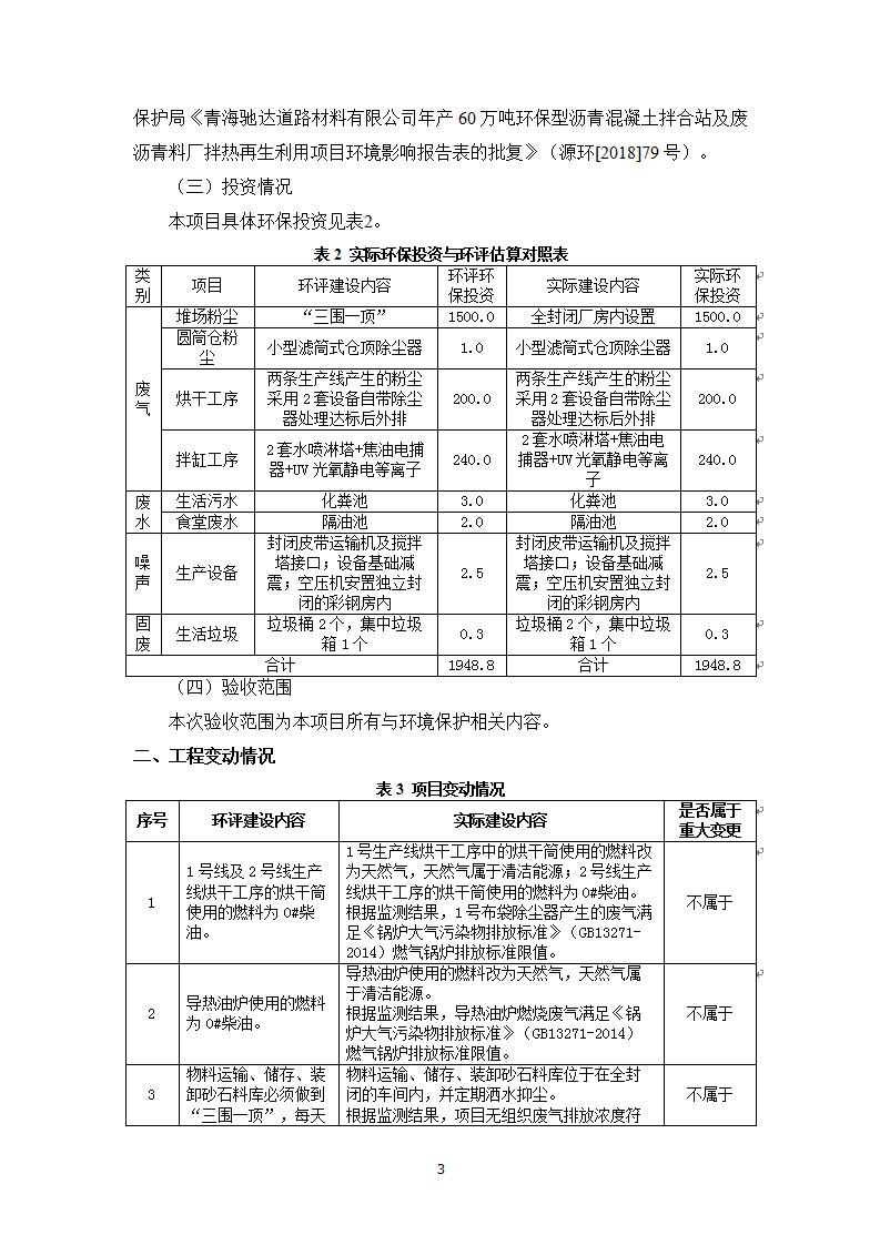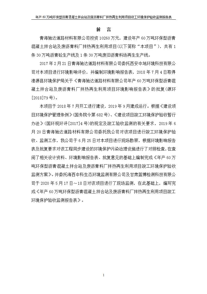 根據中華人民共和國國務院令第682號《國務院關于修改〈建設項目環(huán)境保護管理條例〉的決定》和《建設項目竣工環(huán)境保護驗收暫行辦法》(國務院令682號),青海馳達道路材料有限公司年產60萬噸環(huán)保型瀝青混凝土拌合站及廢瀝青料廠拌熱再生利用項目竣工環(huán)境保護驗收監(jiān)測報告表公示如下。 一、項目名稱:年產60萬噸環(huán)保型瀝青混凝土拌合站及廢瀝青料廠拌熱再生利用項目竣工環(huán)境保護驗收監(jiān)測報告表 二、地點:湟源縣日月藏族鄉(xiāng)池漢素村 三、建設單位:青海馳達道路材料有限公司 四、建設內容:本項目共有2條瀝青砼生產線及1條穩(wěn)定土生產線,配套辦公樓等。 五、聯(lián)系人:楊工 六、聯(lián)系電 話:0971-6515411 七、公示時間:二〇二〇年七月六日至二〇二〇年七月三十一日 公示期間,對上述公示內容如有異議,請以書面形式反饋,個人須署真實姓名,單位須加蓋公章。