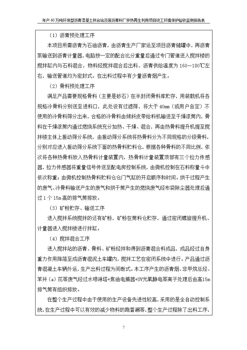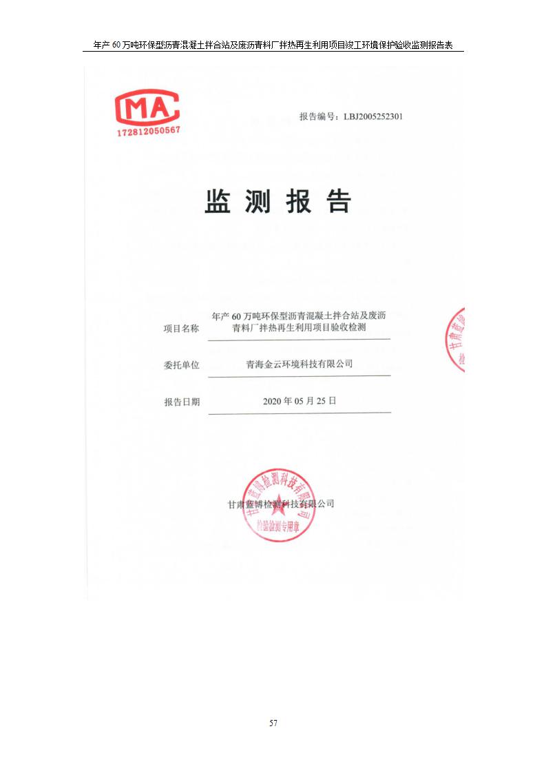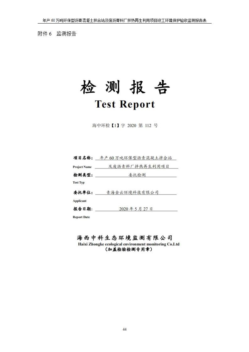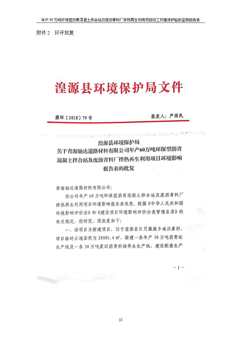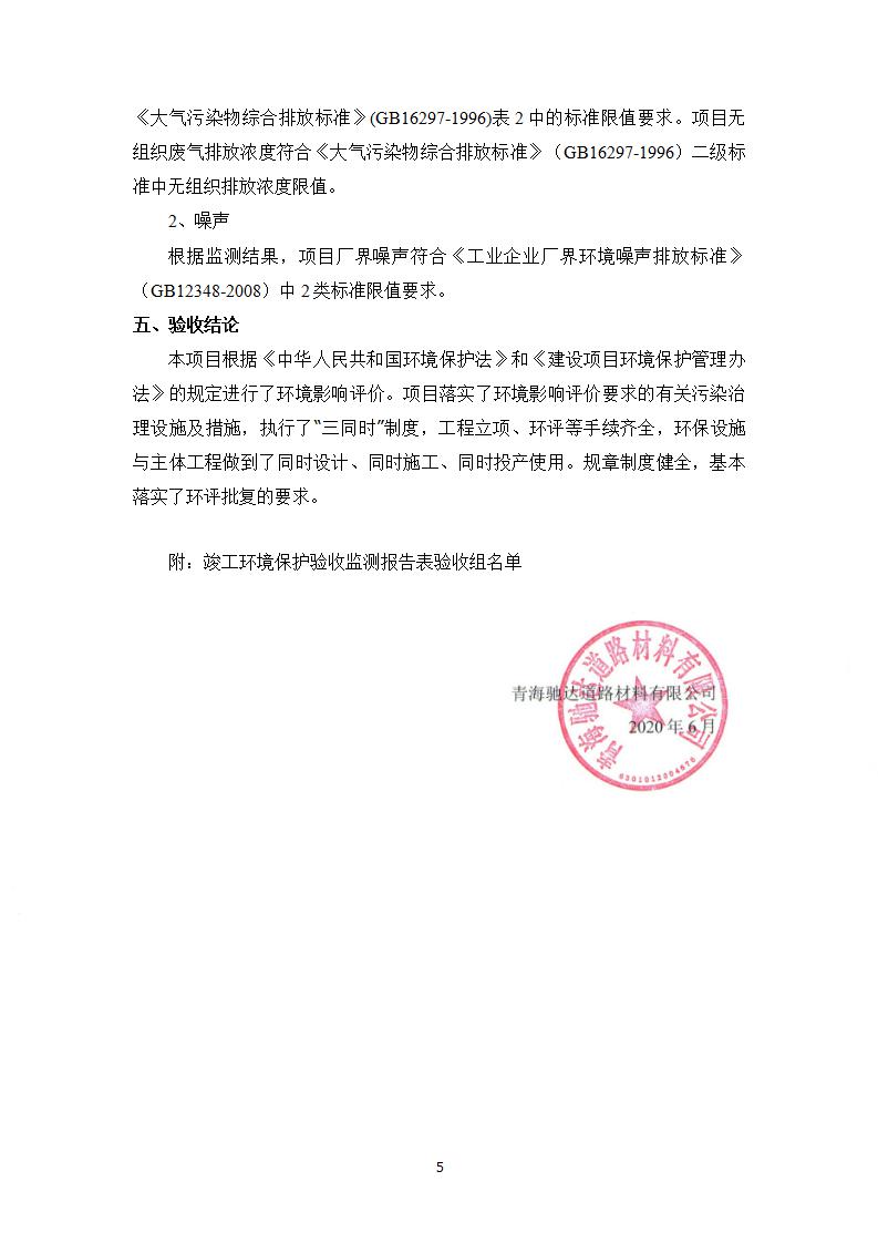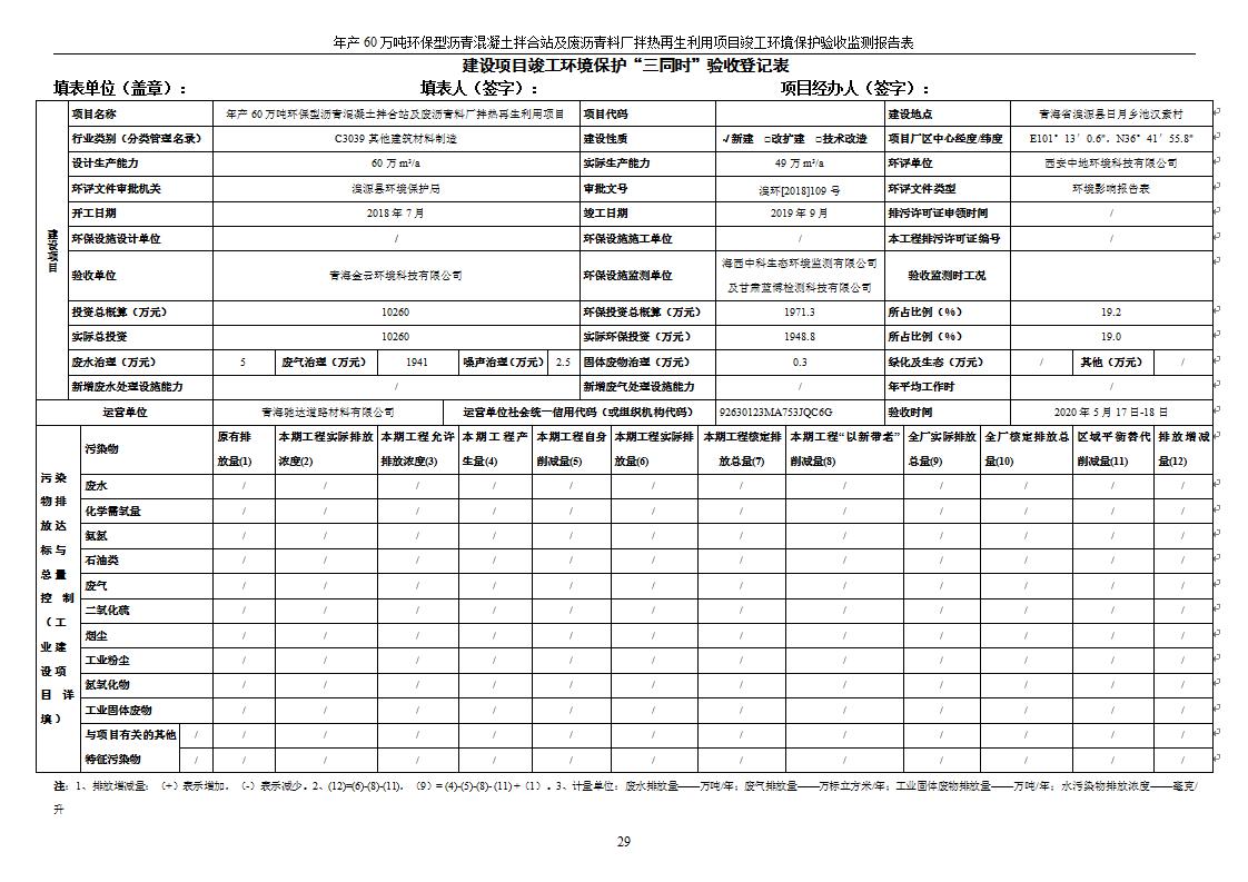根據中華人民共和國國務院令第682號《國務院關于修改〈建設項目環(huán)境保護管理條例〉的決定》和《建設項目竣工環(huán)境保護驗收暫行辦法》(國務院令682號),青海馳達道路材料有限公司年產60萬噸環(huán)保型瀝青混凝土拌合站及廢瀝青料廠拌熱再生利用項目竣工環(huán)境保護驗收監(jiān)測報告表公示如下。 一、項目名稱:年產60萬噸環(huán)保型瀝青混凝土拌合站及廢瀝青料廠拌熱再生利用項目竣工環(huán)境保護驗收監(jiān)測報告表 二、地點:湟源縣日月藏族鄉(xiāng)池漢素村 三、建設單位:青海馳達道路材料有限公司 四、建設內容:本項目共有2條瀝青砼生產線及1條穩(wěn)定土生產線,配套辦公樓等。 五、聯(lián)系人:楊工 六、聯(lián)系電 話:0971-6515411 七、公示時間:二〇二〇年七月六日至二〇二〇年七月三十一日 公示期間,對上述公示內容如有異議,請以書面形式反饋,個人須署真實姓名,單位須加蓋公章。