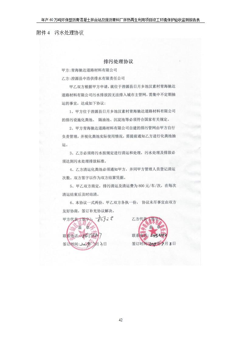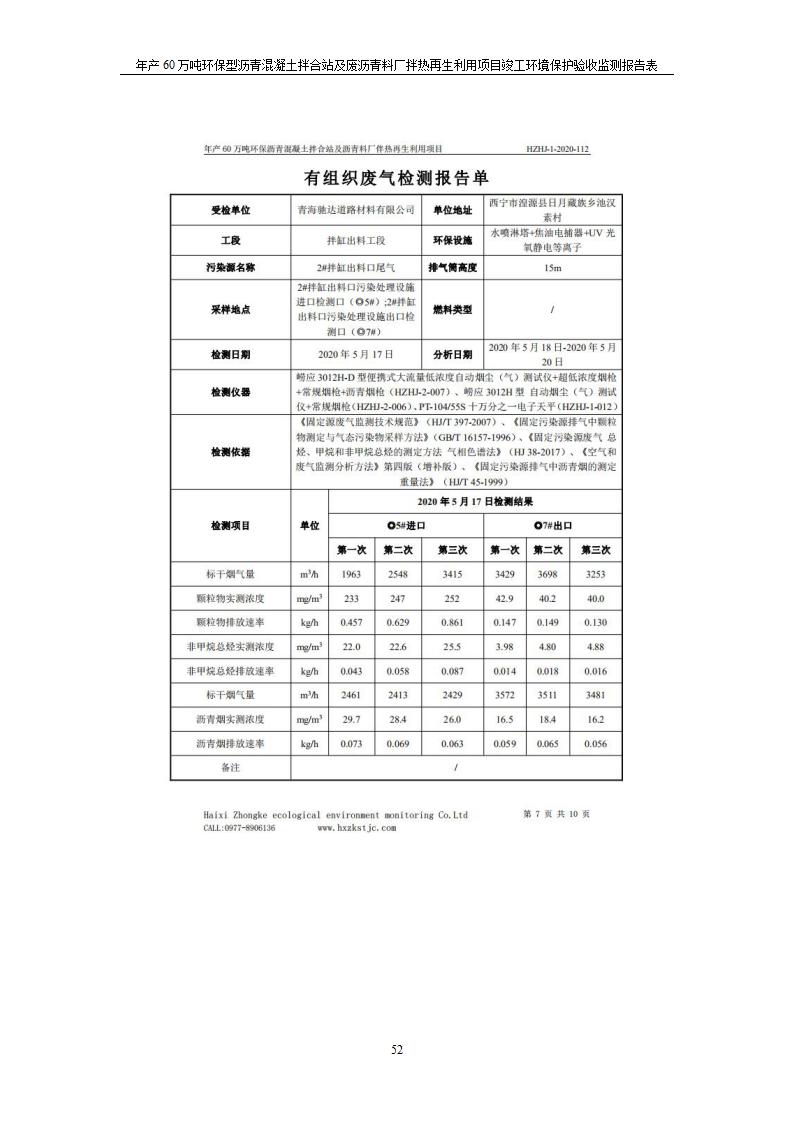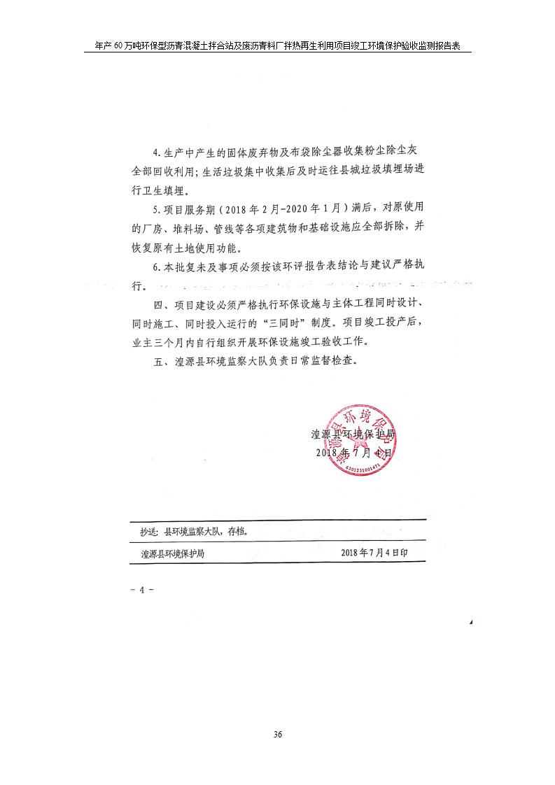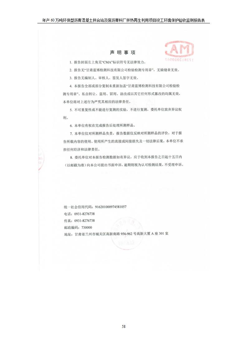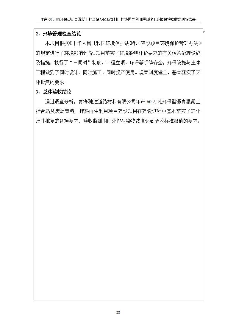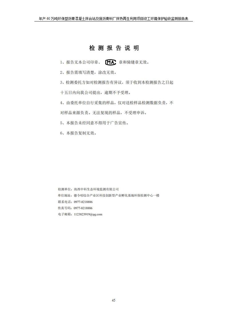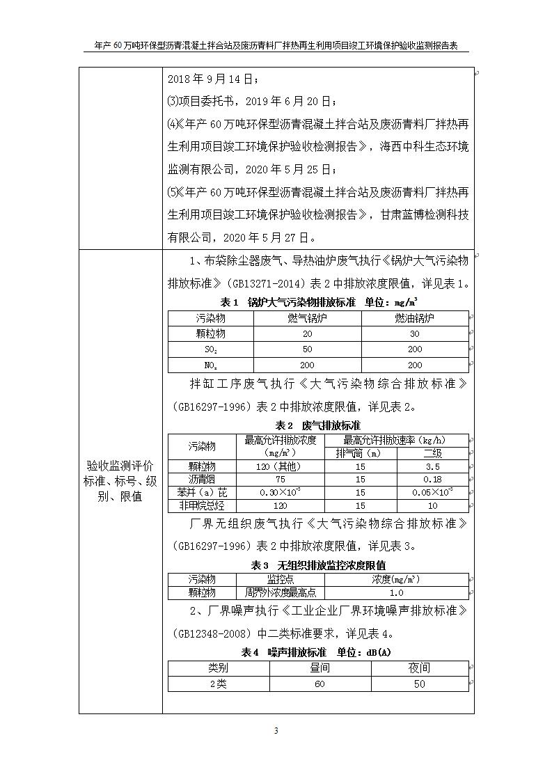 根據中華人民共和國國務院令第682號《國務院關于修改〈建設項目環(huán)境保護管理條例〉的決定》和《建設項目竣工環(huán)境保護驗收暫行辦法》(國務院令682號),青海馳達道路材料有限公司年產60萬噸環(huán)保型瀝青混凝土拌合站及廢瀝青料廠拌熱再生利用項目竣工環(huán)境保護驗收監(jiān)測報告表公示如下。 一、項目名稱:年產60萬噸環(huán)保型瀝青混凝土拌合站及廢瀝青料廠拌熱再生利用項目竣工環(huán)境保護驗收監(jiān)測報告表 二、地點:湟源縣日月藏族鄉(xiāng)池漢素村 三、建設單位:青海馳達道路材料有限公司 四、建設內容:本項目共有2條瀝青砼生產線及1條穩(wěn)定土生產線,配套辦公樓等。 五、聯(lián)系人:楊工 六、聯(lián)系電 話:0971-6515411 七、公示時間:二〇二〇年七月六日至二〇二〇年七月三十一日 公示期間,對上述公示內容如有異議,請以書面形式反饋,個人須署真實姓名,單位須加蓋公章。